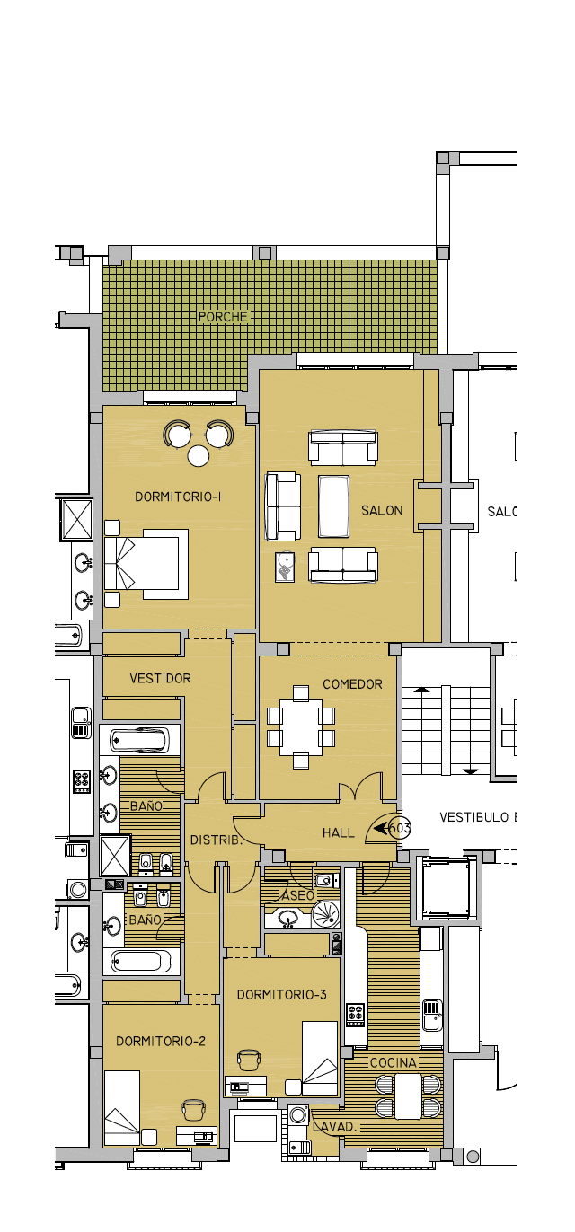 The entrance opens onto a spacious hallway that immediately conveys the apartment’s generous character. To the right is the main living room with a separate dining area, a large space enriched with natural light and direct access to the covered terrace and private garden. This outdoor extension offers an ideal setting for morning coffee, relaxed reading, or quiet evenings overlooking the landscaped surroundings. On the opposite side of the living room is the kitchen with a breakfast area. The adjoining laundry room is discreetly positioned, supporting the home’s clean aesthetic and keeping household tasks out of sight.